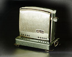 Häßlicher Toaster mit blau-grünem Fuß. Dieses Modell gibt es von verschiedenen Herstellern, siehe z.B. auch PRIVILEG 3411.003.